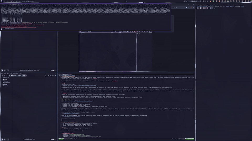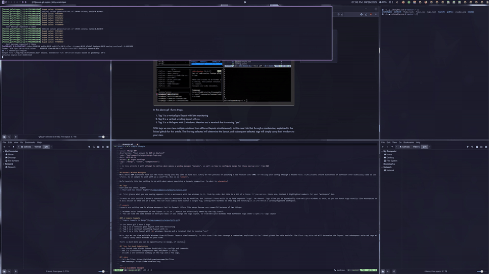 To work on this article I haven’t created a special workspace for my workflow, but instead I have built it up from separate “tags”. On demand. Tags allow you to dynamically view multiple windows at once, or you can treat tags exactly like workspaces and just switch to them one at a time. You can also simply work within a single tag, adding more windows to that tag and treating it as you would a i3/sway/hyprland workspace.